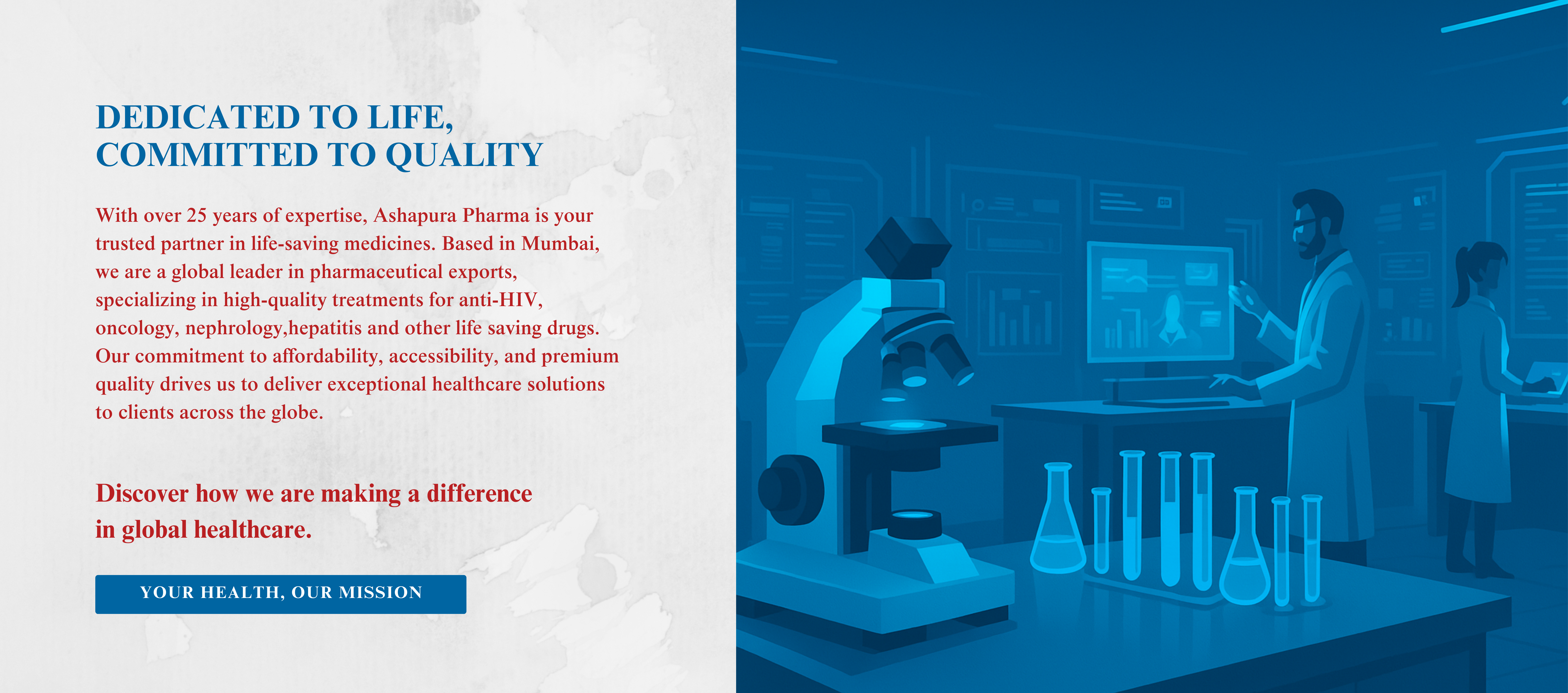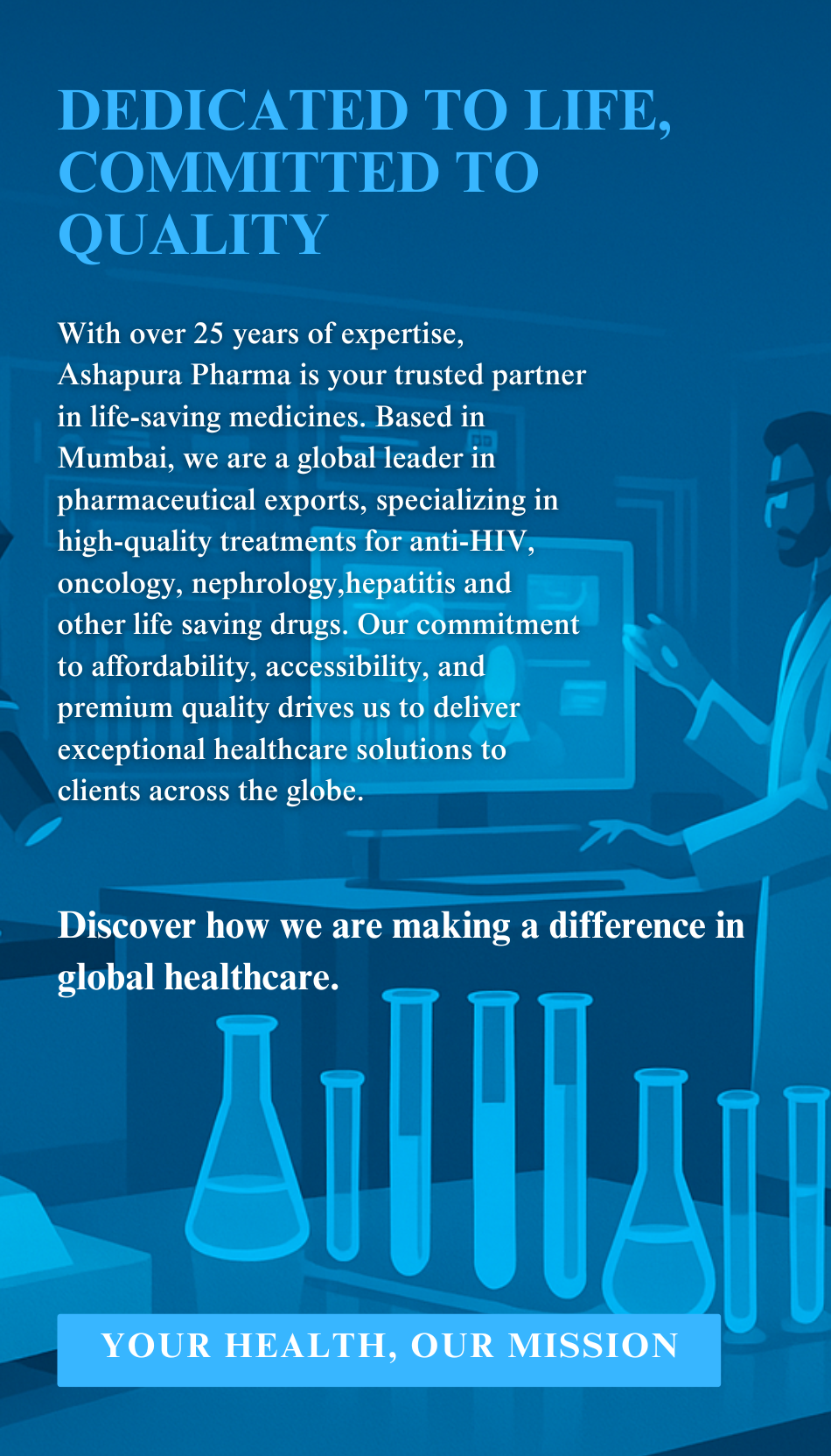 Your Trusted Source for Life-Saving Medicines Since 1996, Ashapura Pharma has been delivering high-quality, life-saving medicines with a portfolio of over 300 products across key therapeutic areas like HIV, oncology, nephrology, hepatitis, and critical care. We serve hospitals, pharmacies, and distributors in over 35 countries, with a commitment to quality, innovation, and affordability.